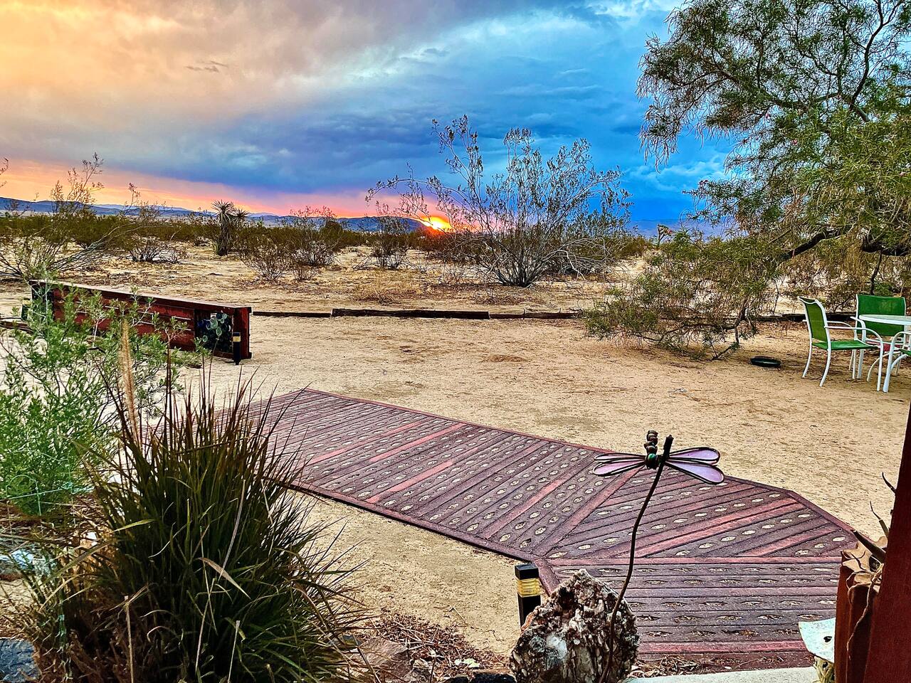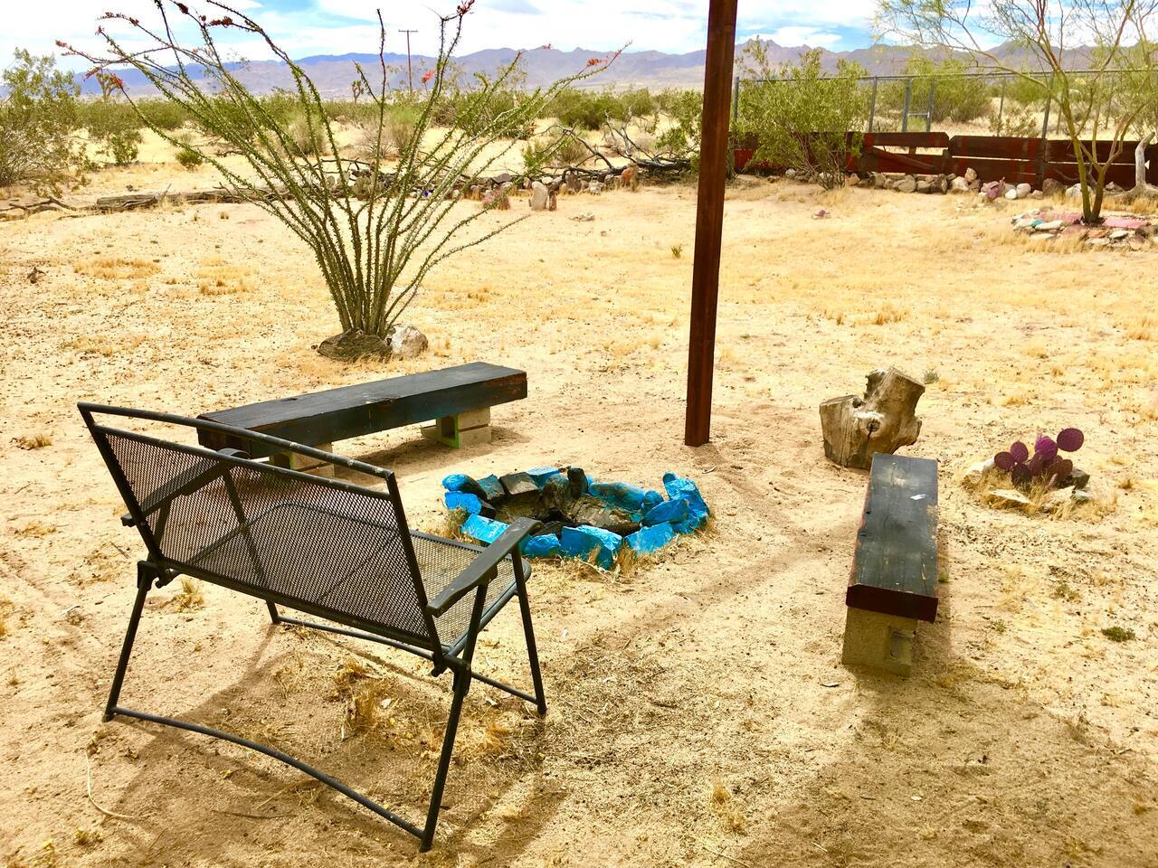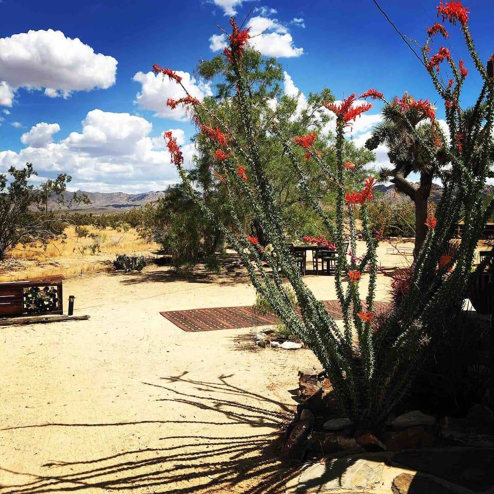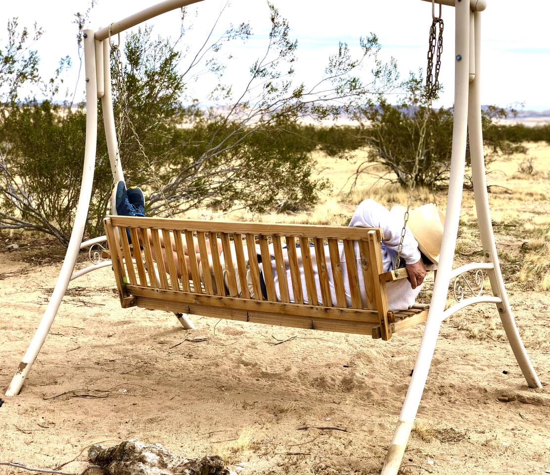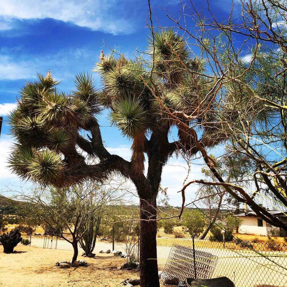 Views! Rare end of cul-de-sac, feel way out, feel an instant exhale. Relax, refresh, and reset in a sparsely populated horse community, perfect desert location close to where you'll go, just 4 minutes to the JT Village, 8 to the JTNP. Private studio duplex (east side) with dedicated parking & entrance. Vibe:Private! Yard, fire pit, & oversized windows, inside views. Gear:Kitchenette, Vinyl, & fast Wi-Fi. Recharge between desert adventures in my solar-powered sanctuary.