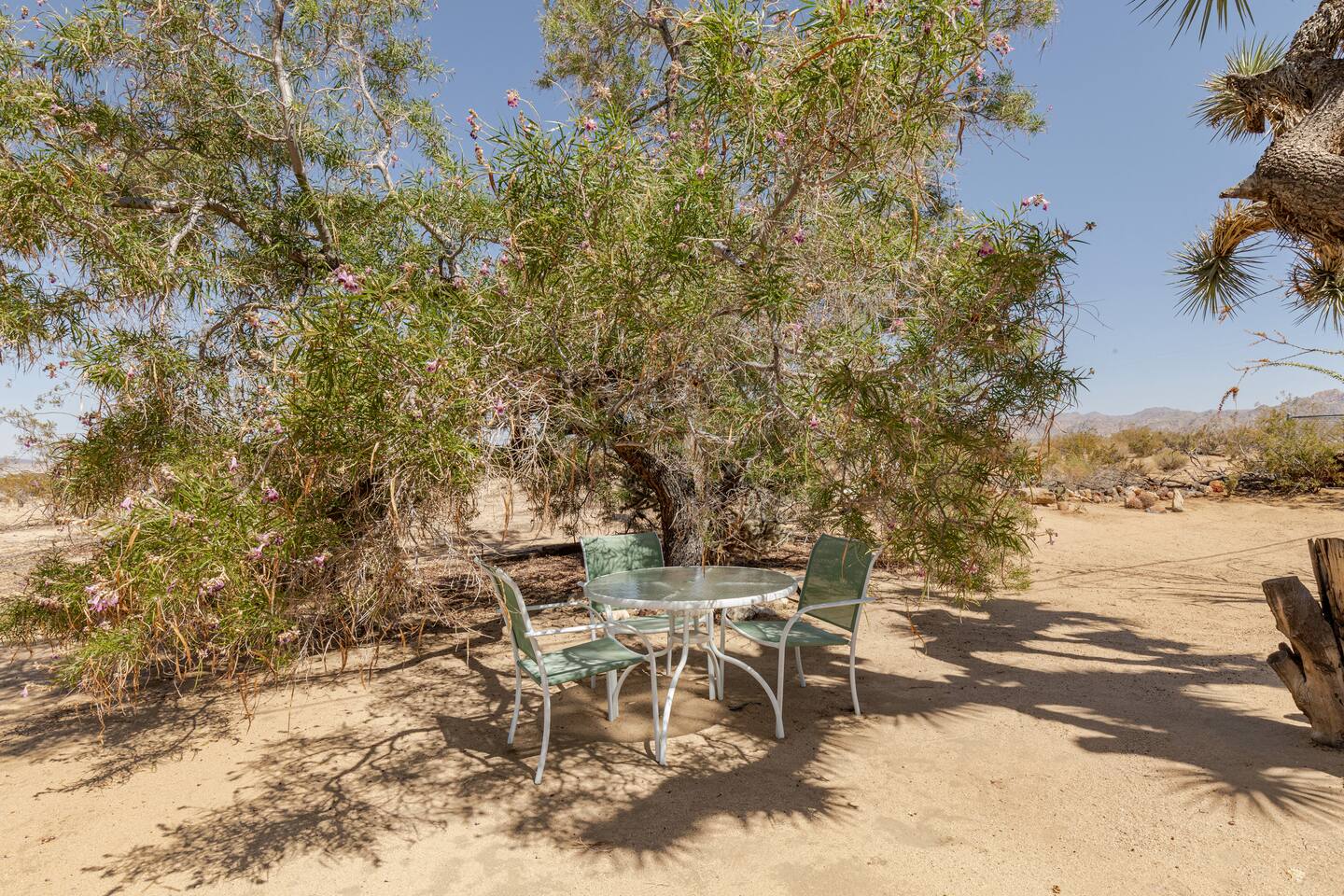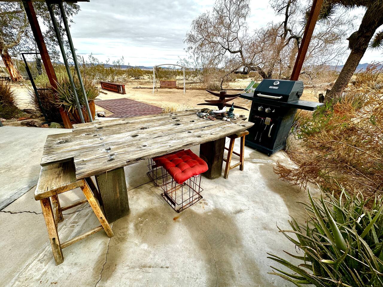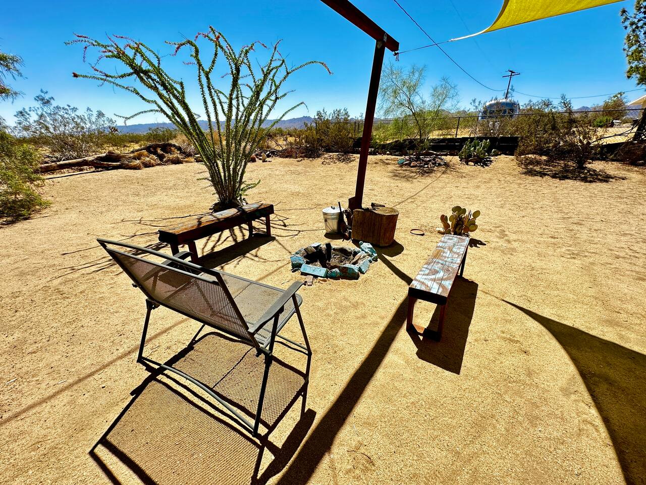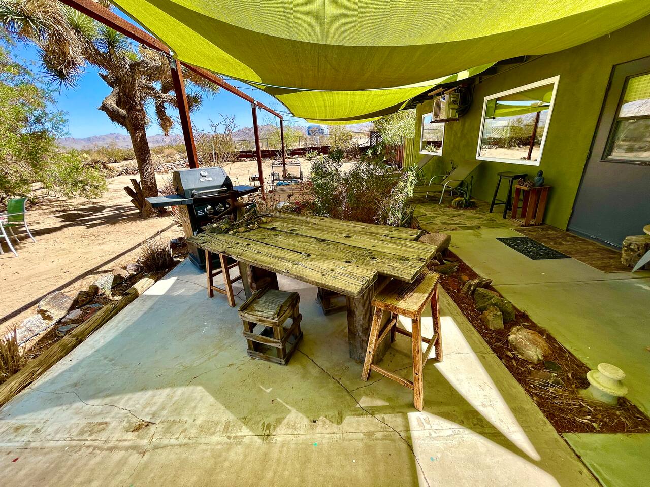 Views! Rare end of cul-de-sac, feel way out, feel an instant exhale. Relax, refresh, and reset in a sparsely populated horse community, perfect desert location close to where you'll go, just 4 minutes to the JT Village, 8 to the JTNP. Private studio duplex (east side) with dedicated parking & entrance. Vibe:Private! Yard, fire pit, & oversized windows, inside views. Gear:Kitchenette, Vinyl, & fast Wi-Fi. Recharge between desert adventures in my solar-powered sanctuary.