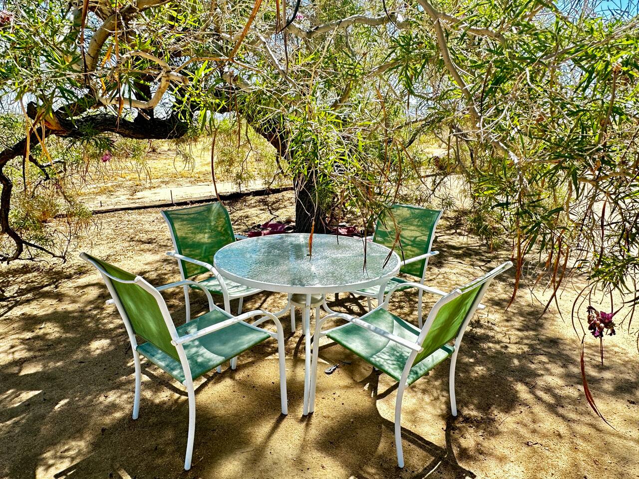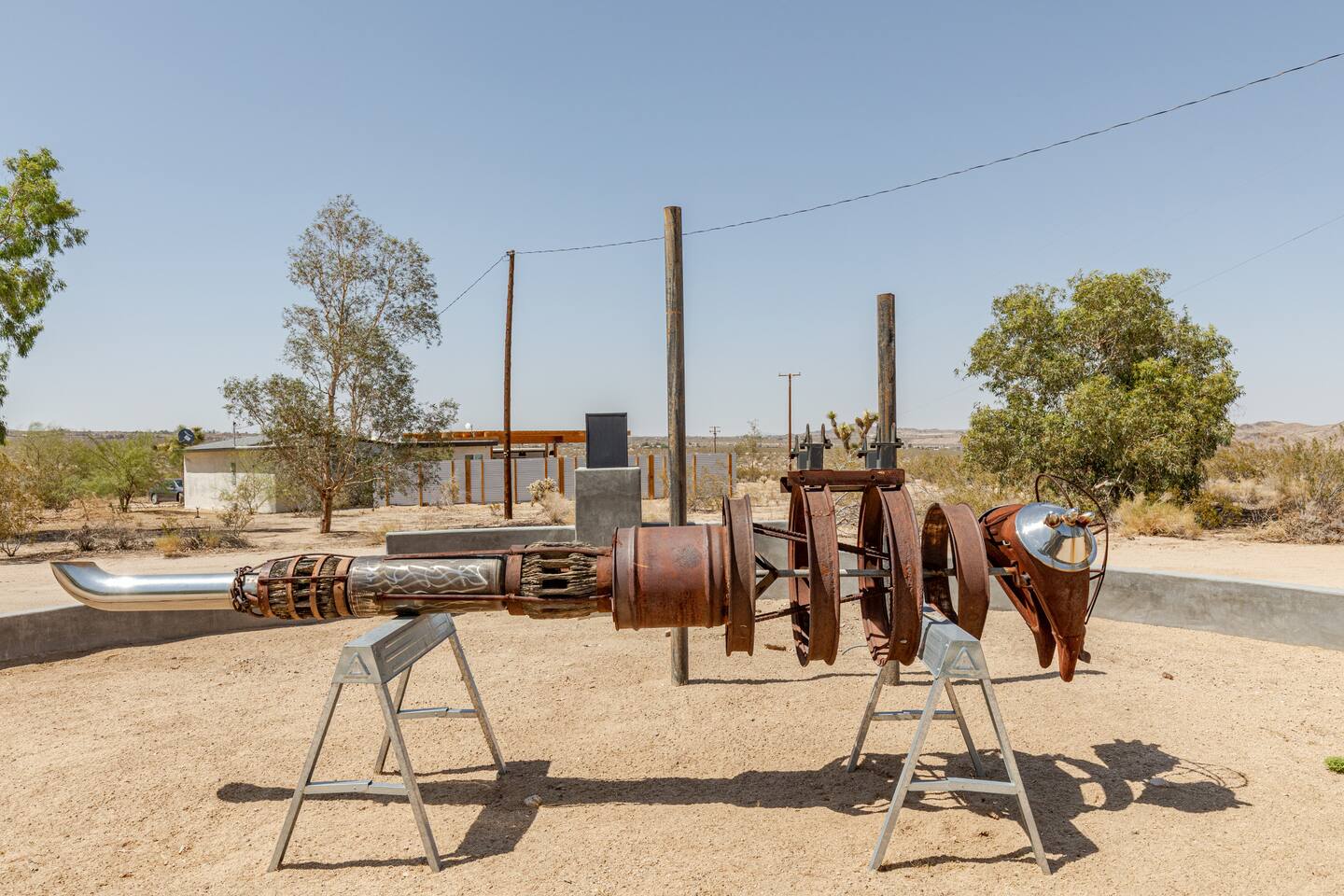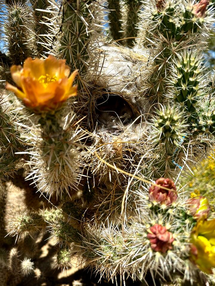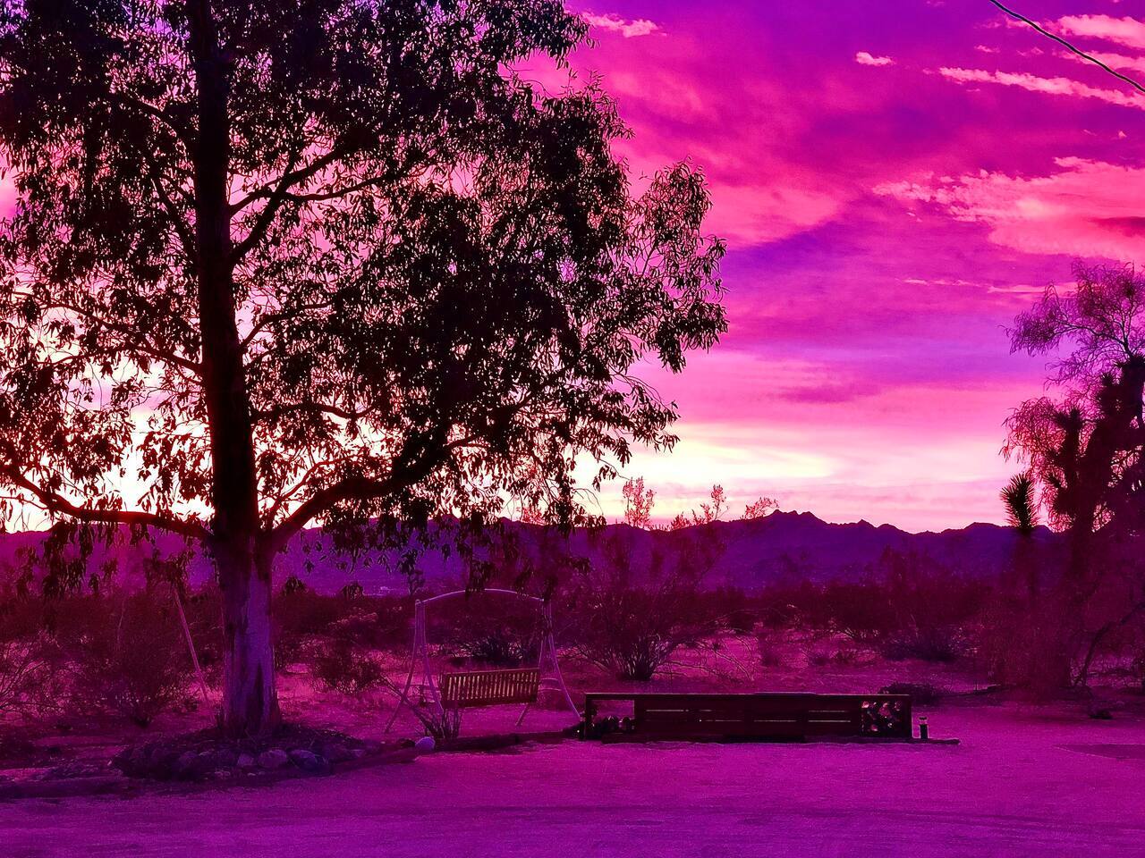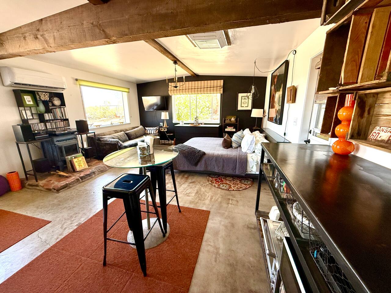 Views! Rare end of cul-de-sac, feel way out, feel an instant exhale. Relax, refresh, and reset in a sparsely populated horse community, perfect desert location close to where you'll go, just 4 minutes to the JT Village, 8 to the JTNP. Private studio duplex (east side) with dedicated parking & entrance. Vibe:Private! Yard, fire pit, & oversized windows, inside views. Gear:Kitchenette, Vinyl, & fast Wi-Fi. Recharge between desert adventures in my solar-powered sanctuary.