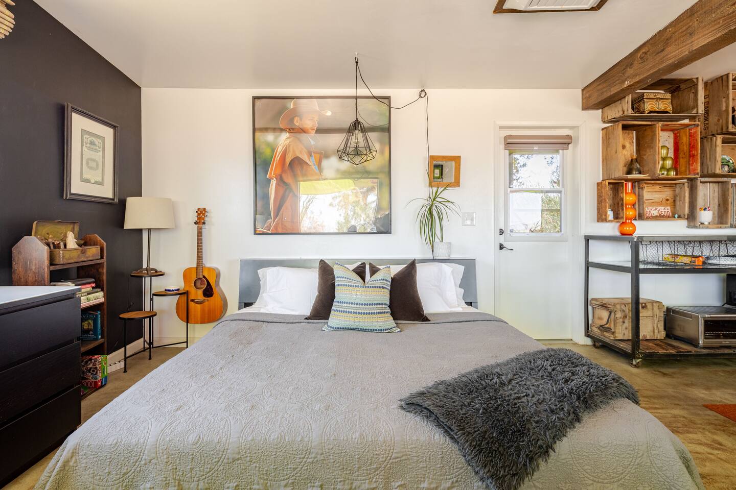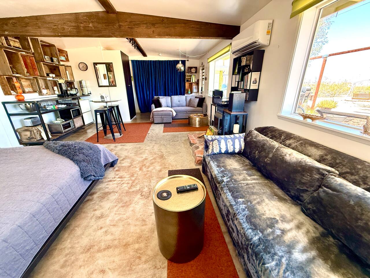 I'm in a rural, very quiet and very little populated area which feels very Joshua Tree expansive and beautiful, on a dirt road, with the feeling of being very far out there but close to the JT Village. 5 minute drive to the Joshua Tree Village, Noah Purafoy, 8 minutes drive Joshua Tree Park/National Monument, 13 minute drive to Pappy and Harriets, 20 minutes to Integratron and 20 to 29 Palms. Walk right out the door for a walkabout through the beautiful High Desert and our sparse neighborhood, you'll feel like you are far away from civilization but close to the Joshua Tree Village, the Joshua Tree Park/National Monument, eateries, art, shopping and all you could want!