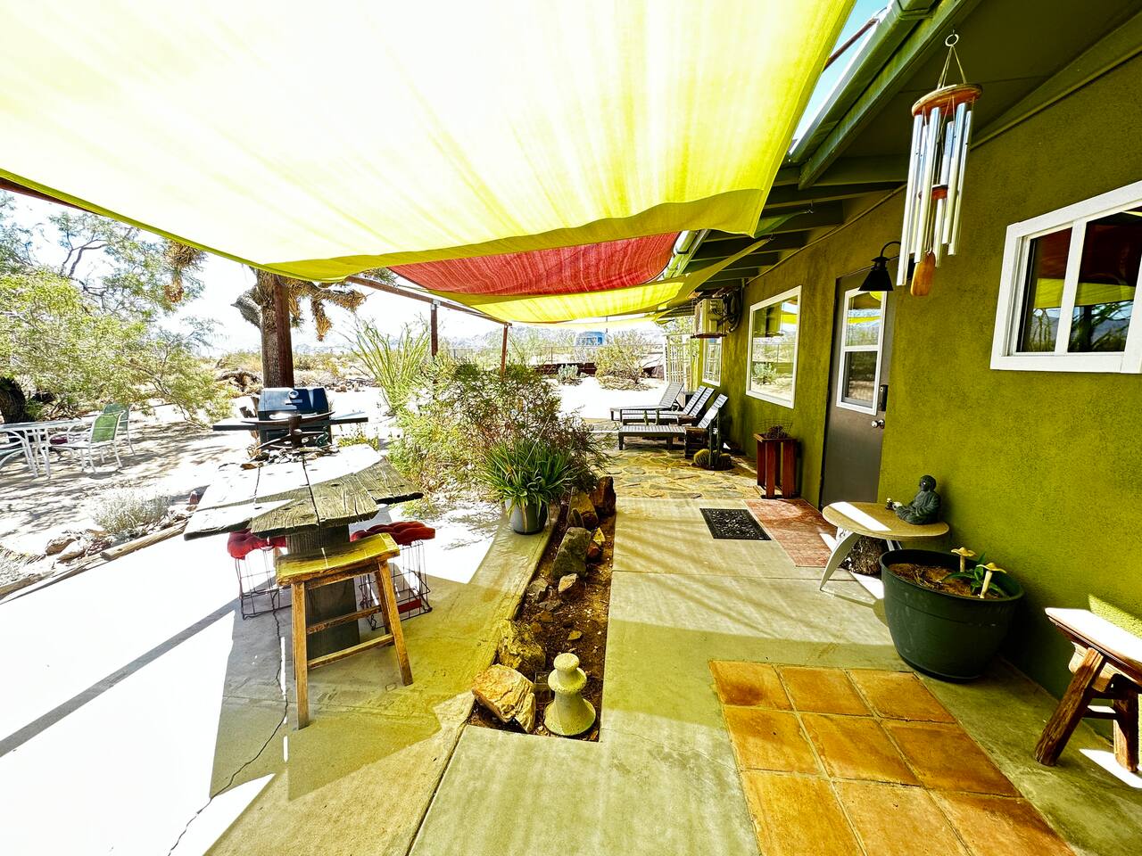 Staying in my beloved home means choosing sustainability without sacrificing luxury—where every sunrise invites adventure and each sunset promises tranquility. Secure your escape to my rare gem where modern amenities meet desert tranquility. Craft memories in an environment that echoes quiet; here is where you refresh and reset amid the whispers of the wild desert wilderness. The ultimate retreat at my serene, Boho, artisanal 1961 Mid-Century Modern haven nestled on a cul de sac, just five minutes from the vibrant heart of Joshua Tree Village. This Ponderosa Studio listing is my home set up as a duplex, you're on the east with your separate parking, private entrance, private patio and yard embraced by expansive desert vistas and under a canvas of stars. My eco-forward abode offers solar-powered living and thoughtful water conservation amidst High Desert landscapes, ensuring your stay harmonizes with nature’s rhythm. Step out into untouched beauty for soul-stirring walks or unwind in your secluded yard—a sanctuary perfect for yoga or stargazing. While you revel in solitude, rest assured that we are centrally located, 8 minutes to JTNP and civilization’s comforts are mere minutes away, with local culture, dining, and natural wonders within easy reach. Join me for an unparalleled Joshua Tree experience—book now to ensure your slice of paradise awaits.
